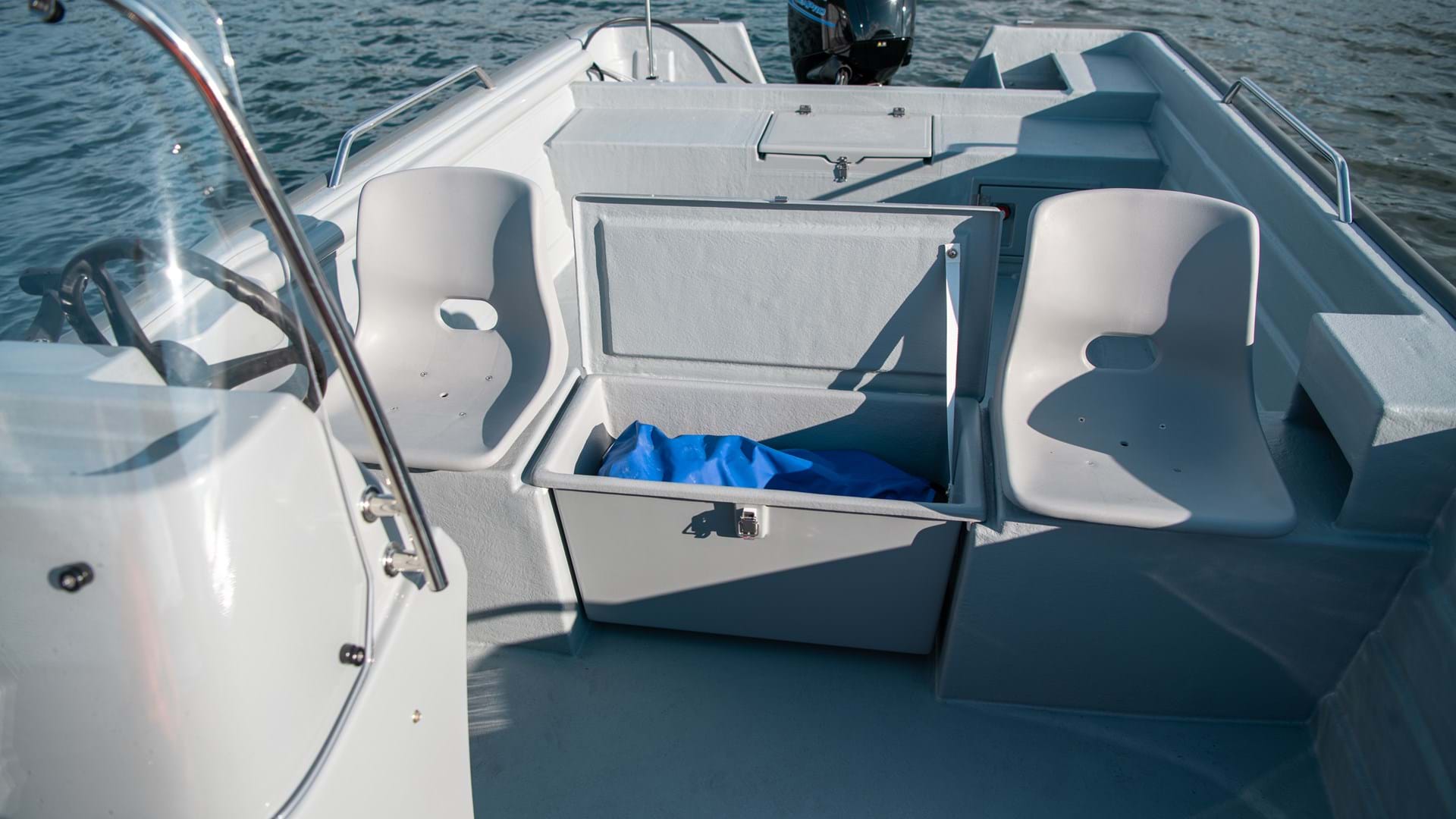 High freeboards and solid railings offer additional support, making it easier to pull in heavy lines or haul pots from the depths. You can stow bags and tackle boxes underneath the seat, while buoys and ropes have a designated compartment under the bow step.