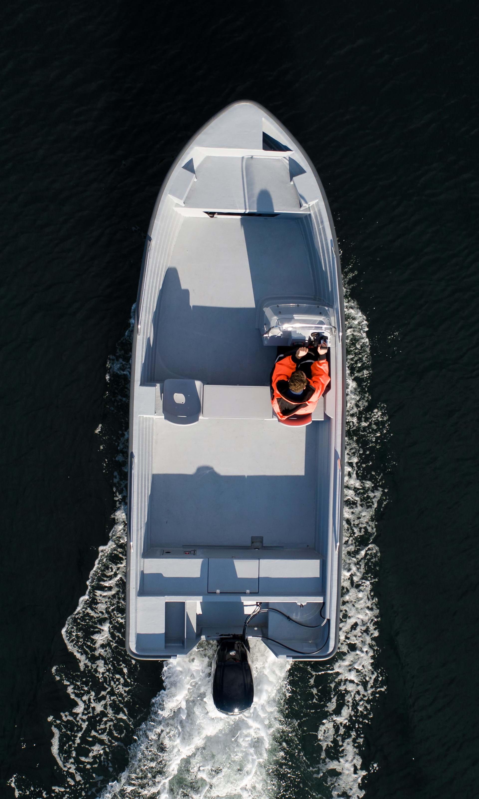 Fishing trips often involve long hours at sea, and staying dry when traversing rough waters is essential. Our solution is a hull that directs water spray to the sides when ploughing through waves. Together with the high freeboards, this ensures a comfortable and dry experience aboard.